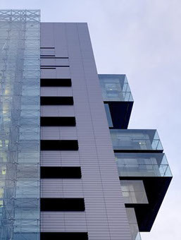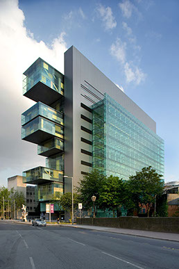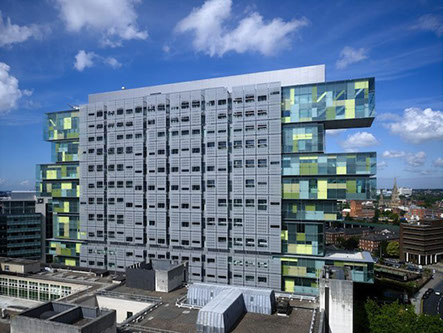 Manchester Civil Justice Centre is an award winning building for 50 courtrooms, using low energy environmental principals such as solar shading and natural ventilation that have informed its unique appearance. The building is broken into three linear elements each representing a distinct function, courtrooms, core and public space. The elevated projecting boxes enclose courtrooms while the main facade is expressed by solar screening to the courtroom corridors.  Due to its high sustainable design, the building has achieved a BREEAM rating of excellent.