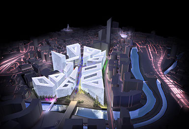 Wellington Place mixed-use masterplan development, by Feilden Clegg Bradley Studios, occupies a former old railway station site in Leeds.  The low carbon development is designed around a series of public squares and pedestrian connections. The sculptural building forms are a result of defining key routes through the site, while the roofs forms maximise daylight into the streets and squares. The sculptural forms are accentuated by use of solid stone fabric with deep reveals.