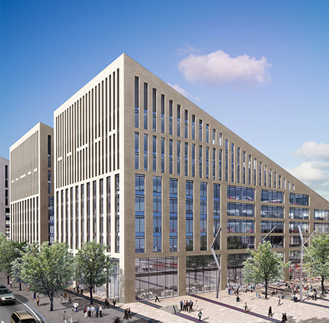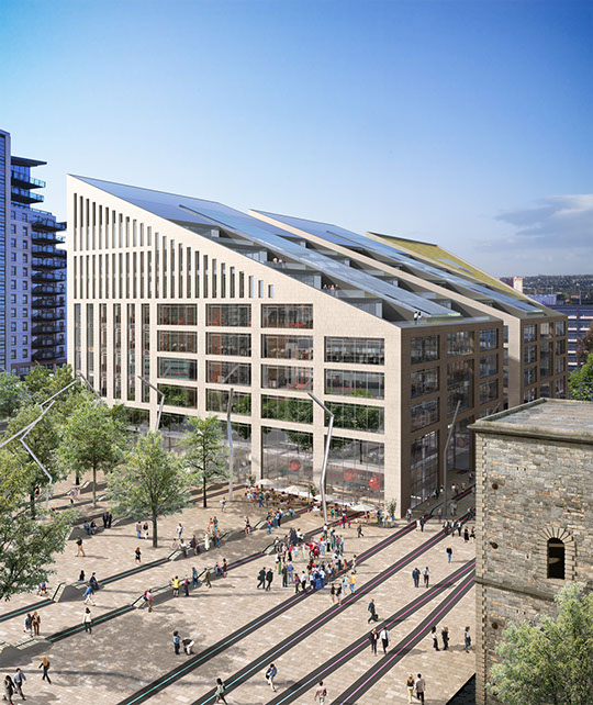 Wellington Place mixed-use masterplan development, by Feilden Clegg Bradley Studios, occupies a former old railway station site in Leeds. The low carbon development is designed around a series of public squares and pedestrian connections. The sculptural building forms are a result of defining key routes through the site, while the roofs forms maximise daylight into the streets and squares. The sculptural forms are accentuated by use of solid stone fabric with deep reveals.